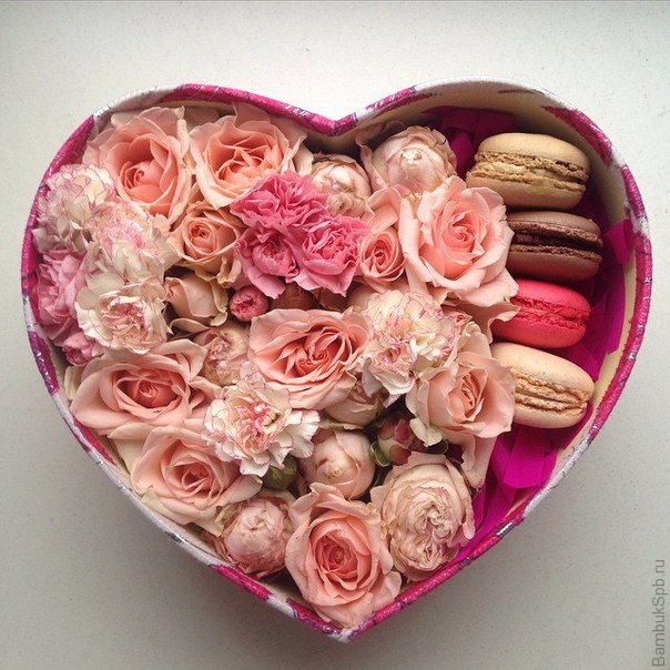 Состав: пирожное макаронс - 4 шт., в составе композиции присутсвуют диантусы, розы одноголовые и пионовидные кустовые в нежных тонах, декор, коробка в форме сердца