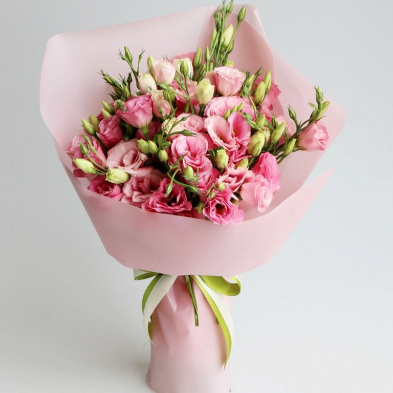 Состав букета: эустома - 13 шт., упаковка крафт, лента
