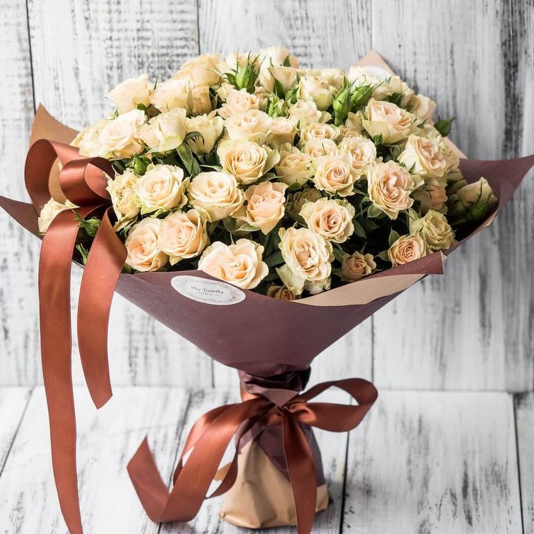 Состав букета: роза кустовая кремовая - 19 шт., упаковка крафт, лента