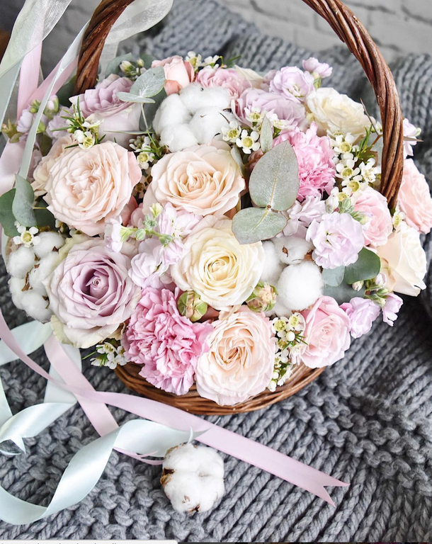 Состав композиции: роза светлокремовая - 5шт., роза светлорозовая - 5 шт., хлопок - 5 шт, диантус -5 шт, маттиола - 3 шт, ваксфлауэр - 2 шт, эвкалипт - 2 шт, корзина малая D25.
