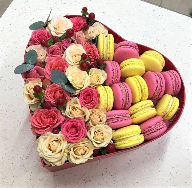 Состав композиции: роза, эвкалипт, гиперикум, макаронсы - 15 шт, коробка в форме сердца