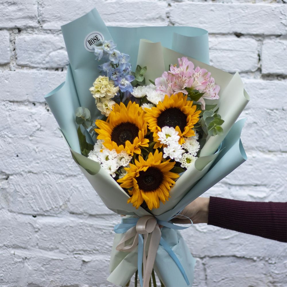 Состав: подсолнух - 3шт., дельфиниум - 1шт., сантини - 3шт., маттиола - 1 шт., альстромерия - 1шт., эвкалипт - 1шт.