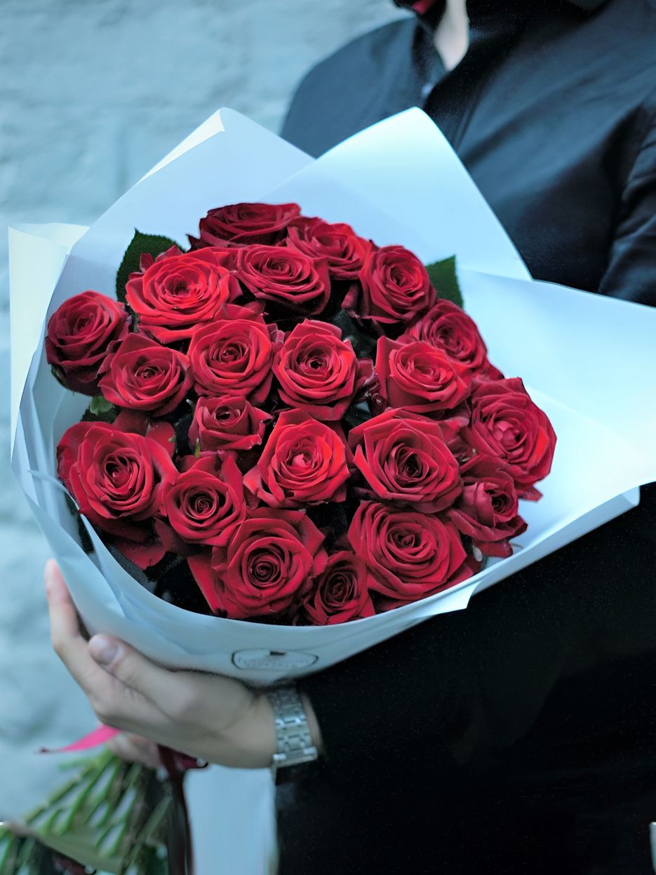 Состав: роза красная - 21 шт., упаковка -1 шт., лента - 1 шт.
