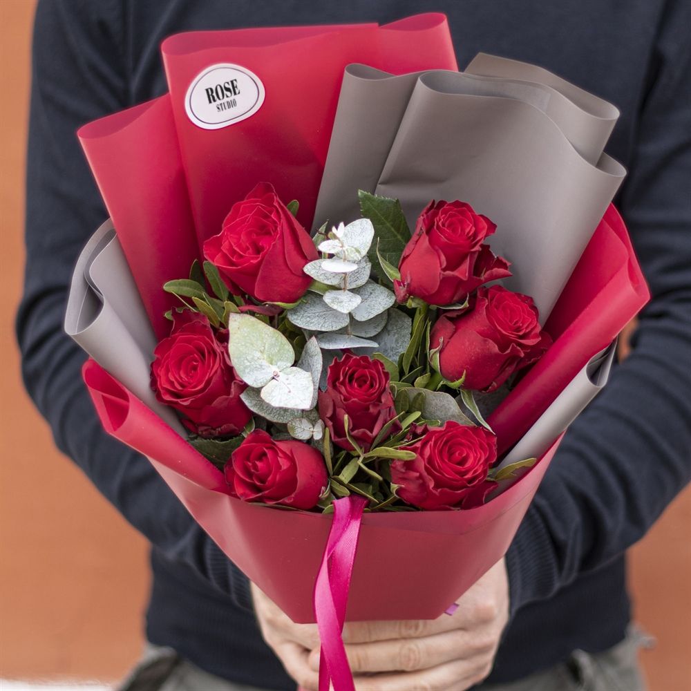 Состав: роза красная - 7 шт., эвкалипт., упаковка матовая, лента атласная.