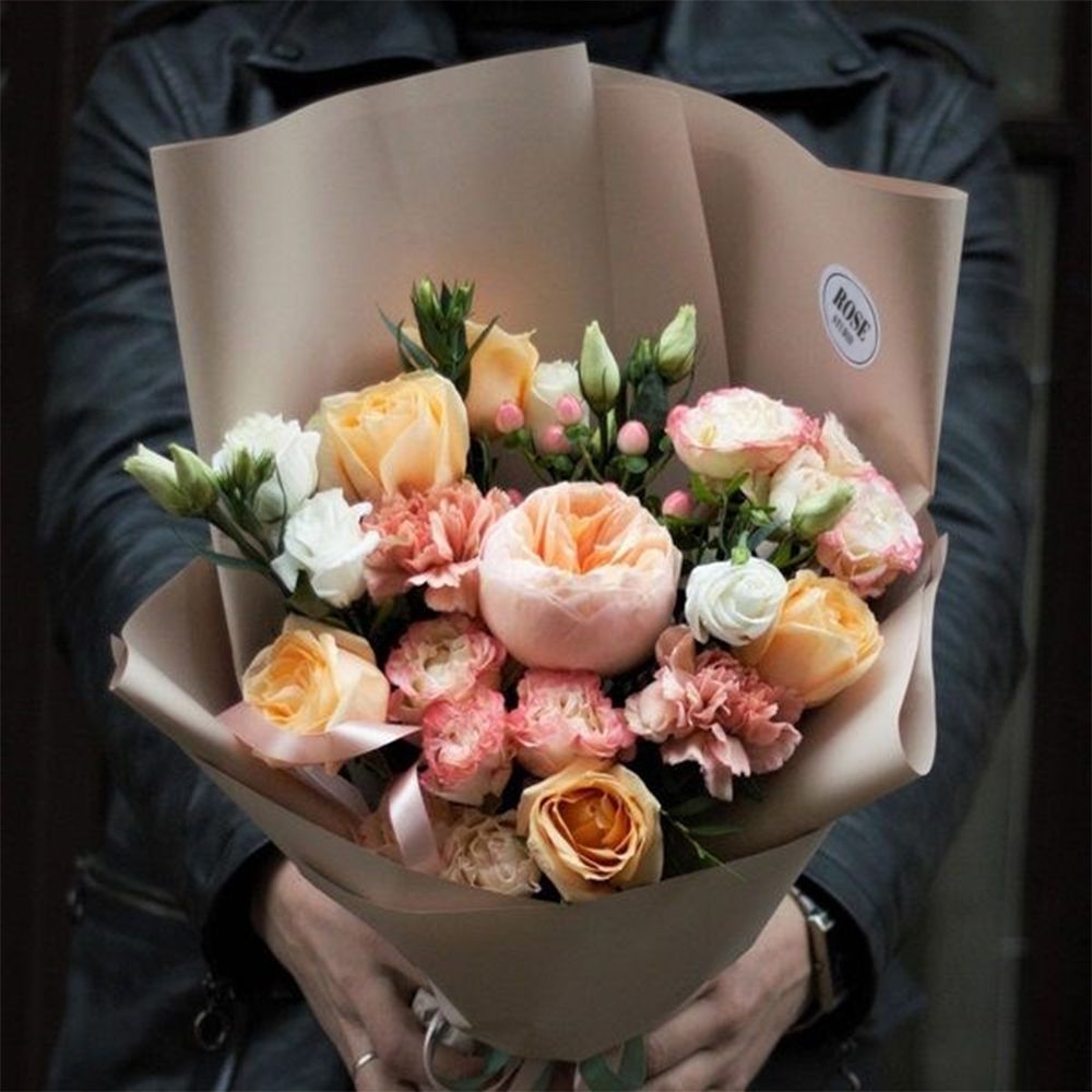 Состав: роза пионовидная Джульетта - 1 шт., роза кустовая пионовидная - 2 шт., роза - 5 шт., гиперикум - 1 шт., диантус Карамель - 2 шт., эустома - 1 шт., зелень, корейская упаковка