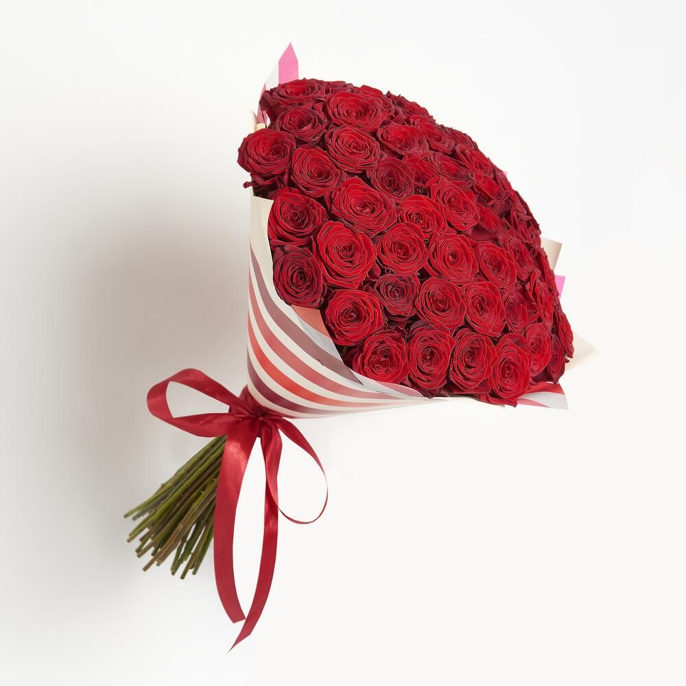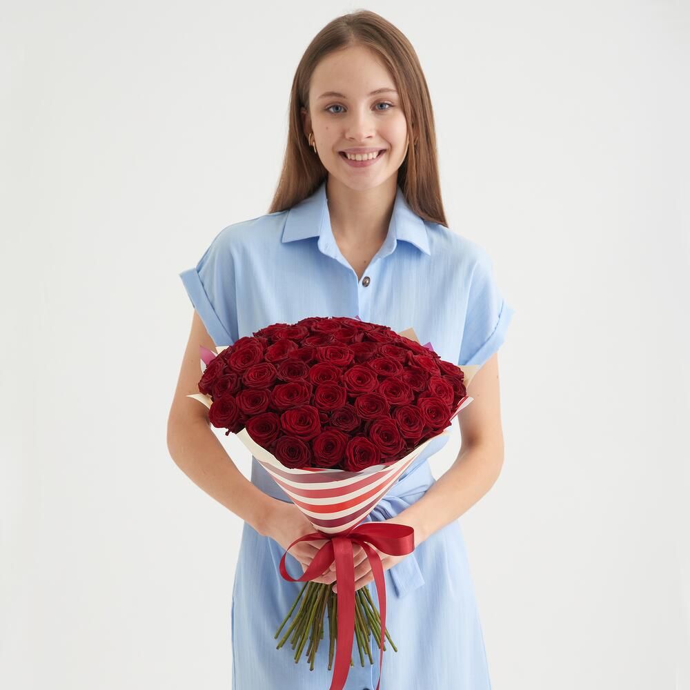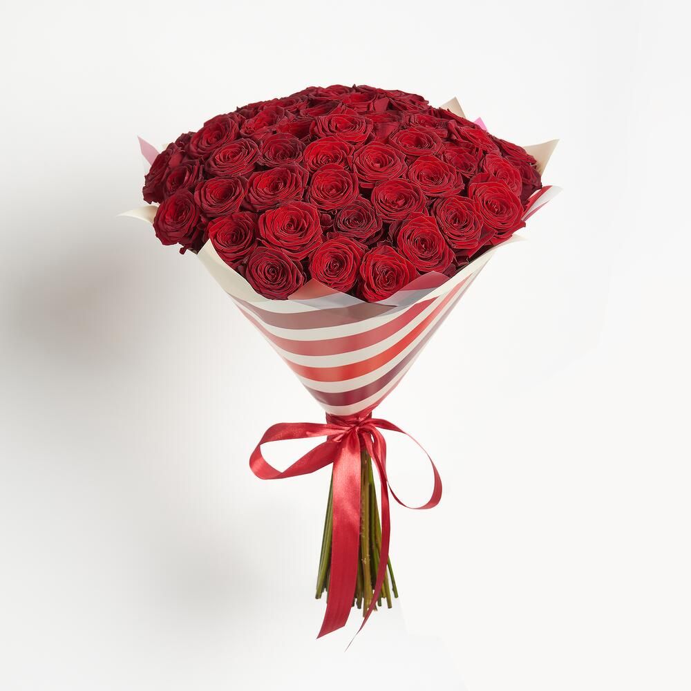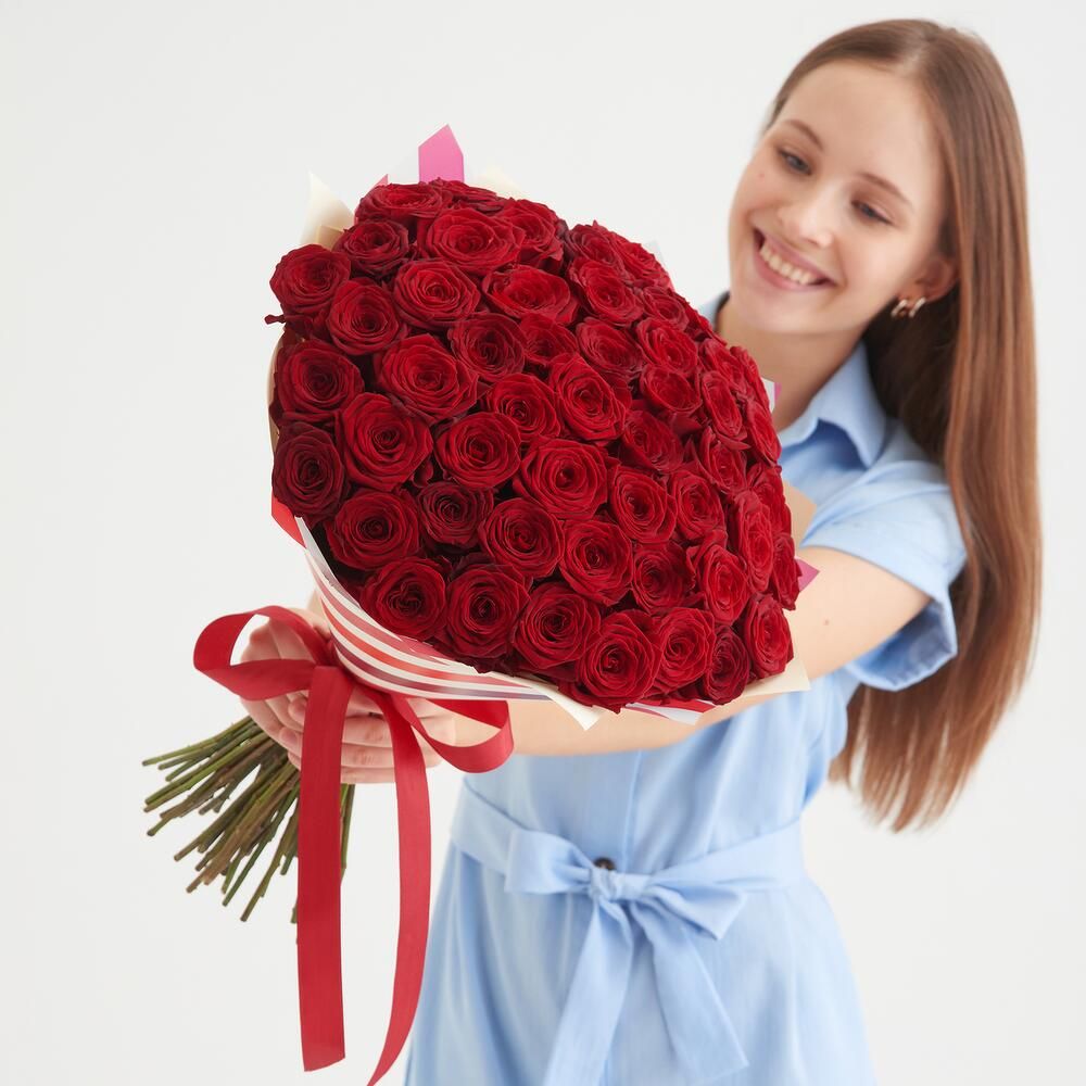 Состав: роза красная - 51 шт., упаковка -1 шт., лента - 1 шт.