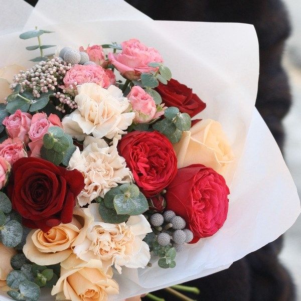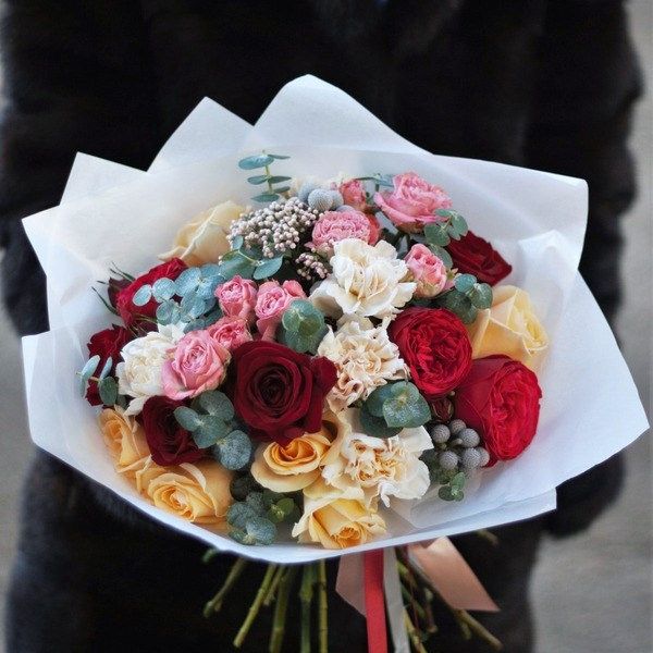 Состав: роза —10шт., эвкалипт —10шт., диантус —5шт., роза пионовидная —3шт., роза кустовая —2шт., озотамнус —1шт.