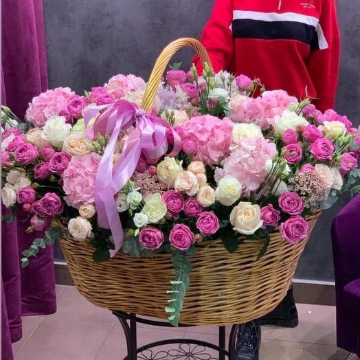 Корзина с гортензией и пионовидными розами