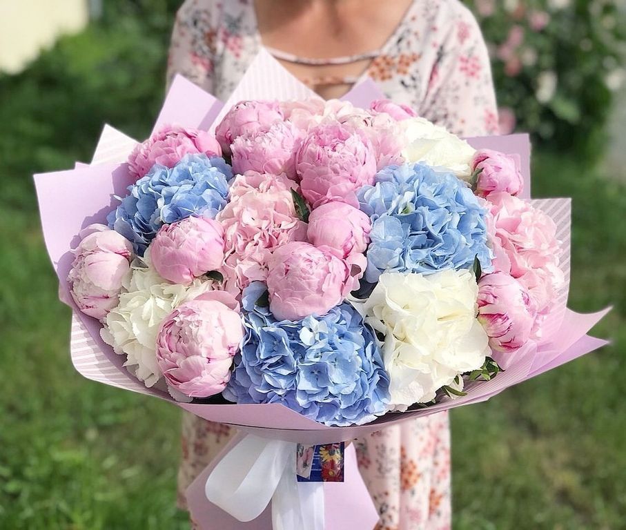 Состав: гортензия - 10 шт, пион - 15 шт, упаковка, лента