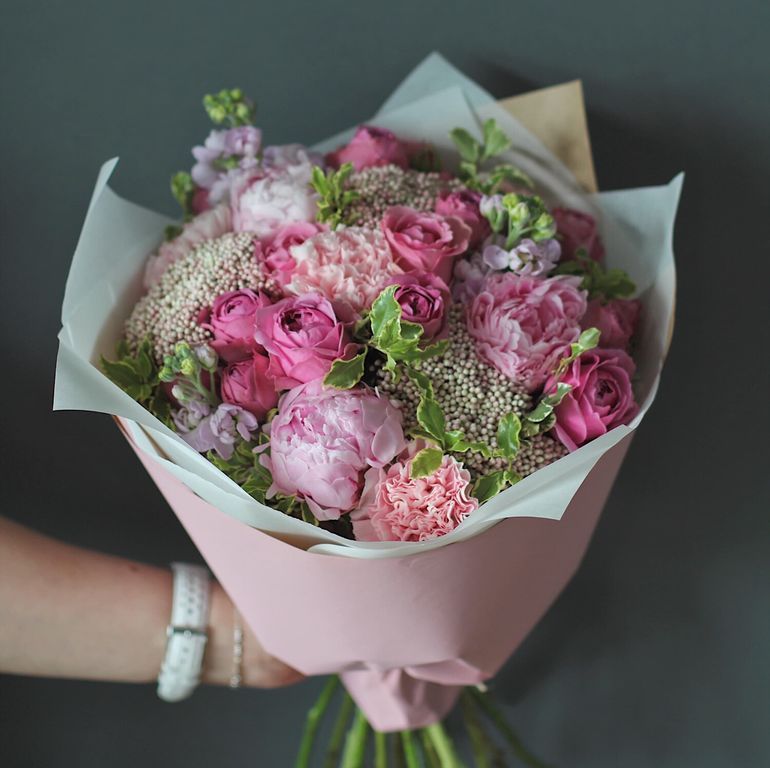 Букет упакован в дизайнерскую бумагу розового цвета и белый пергамент, перевязан атласной лентой.*Состав Букета может немного изменяться в зависимости от сезонности и наличия цветов.Букет будет по ценности и цветовой гамме абсолютно идентичный.