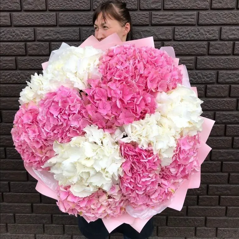 ТипбукетВид цветовгортензияВысота50 смДиаметр60 смЦветБело-розовый микс