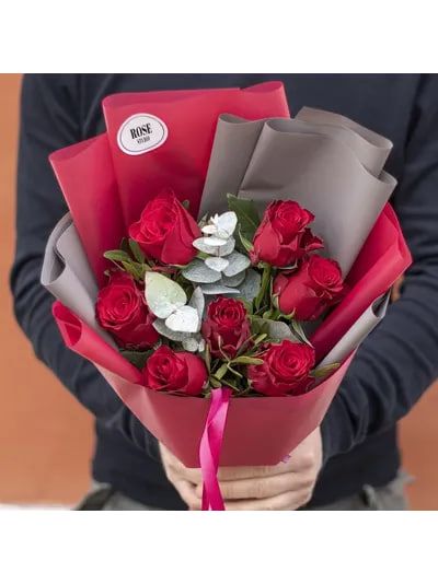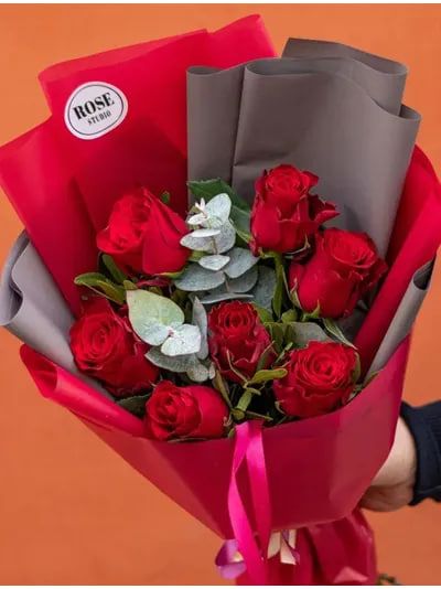 Состав: роза красная - 7 шт., эвкалипт, упаковка матовая, лента атласная