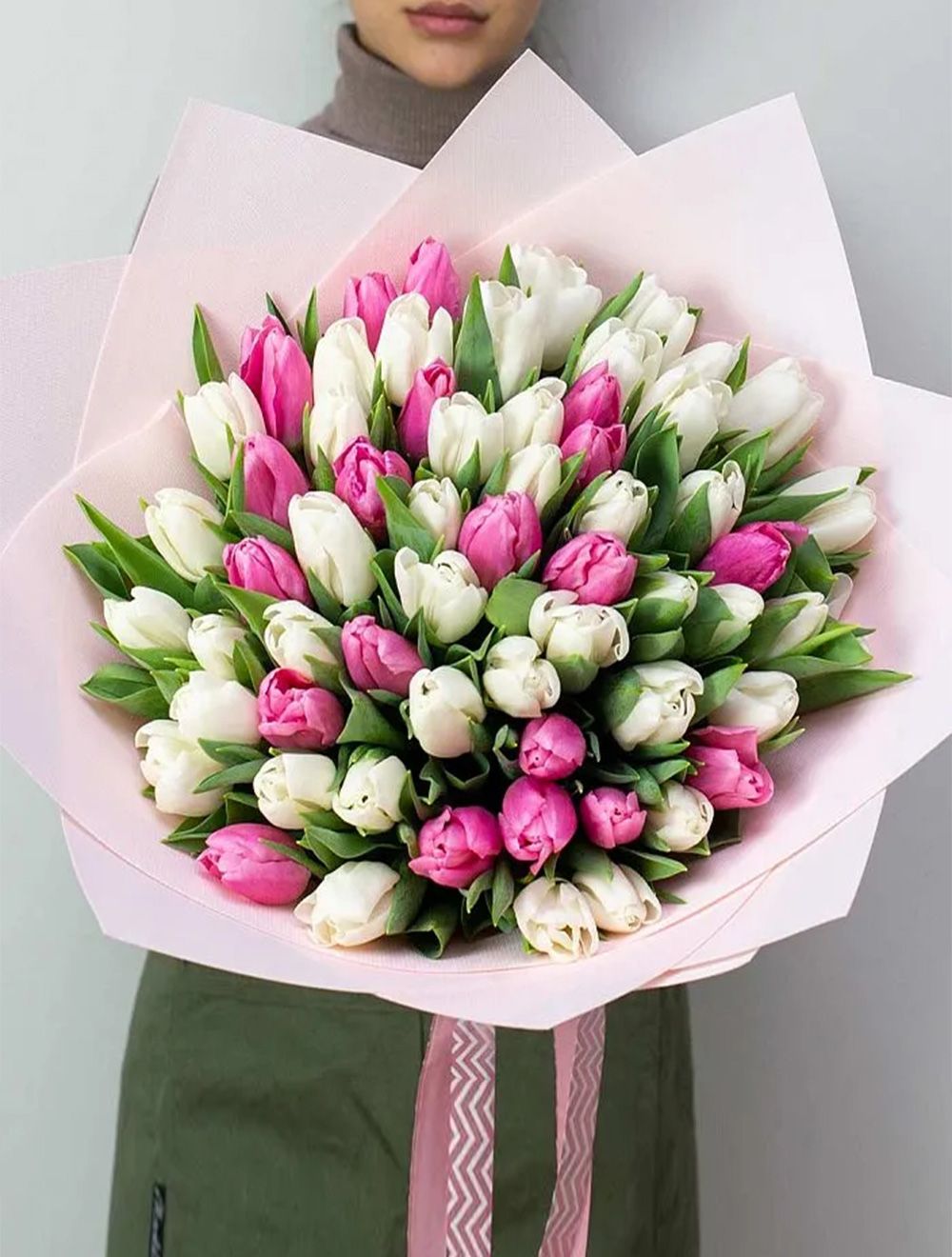ТипбукетВид цветовтюльпанВысота50 смДиаметр45 смЦветРозовый микс