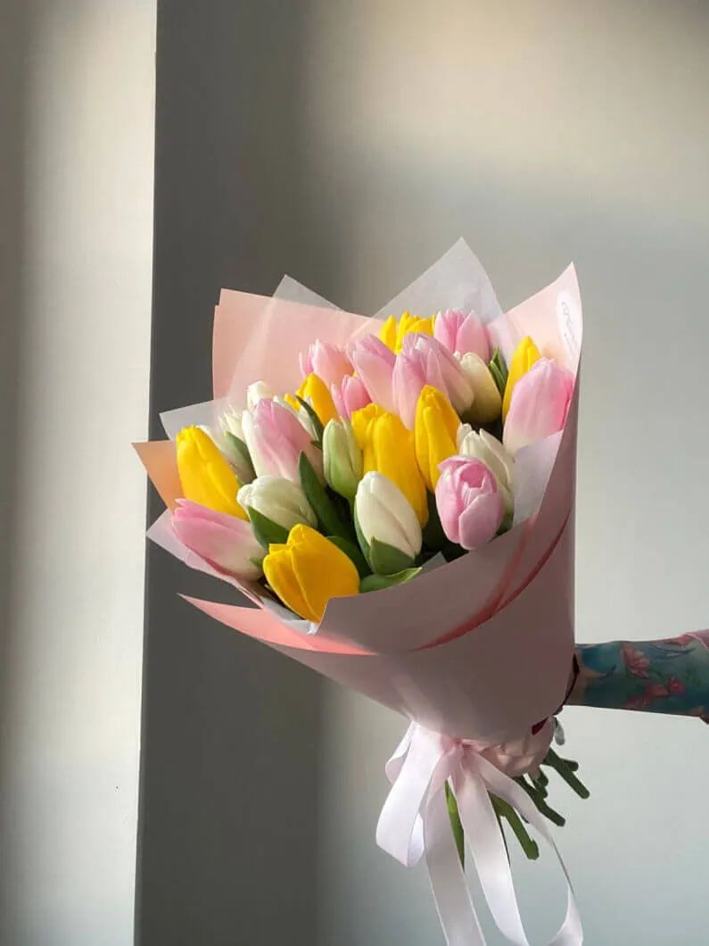 Состав: тюльпан микс - 31 шт, упаковка, лента