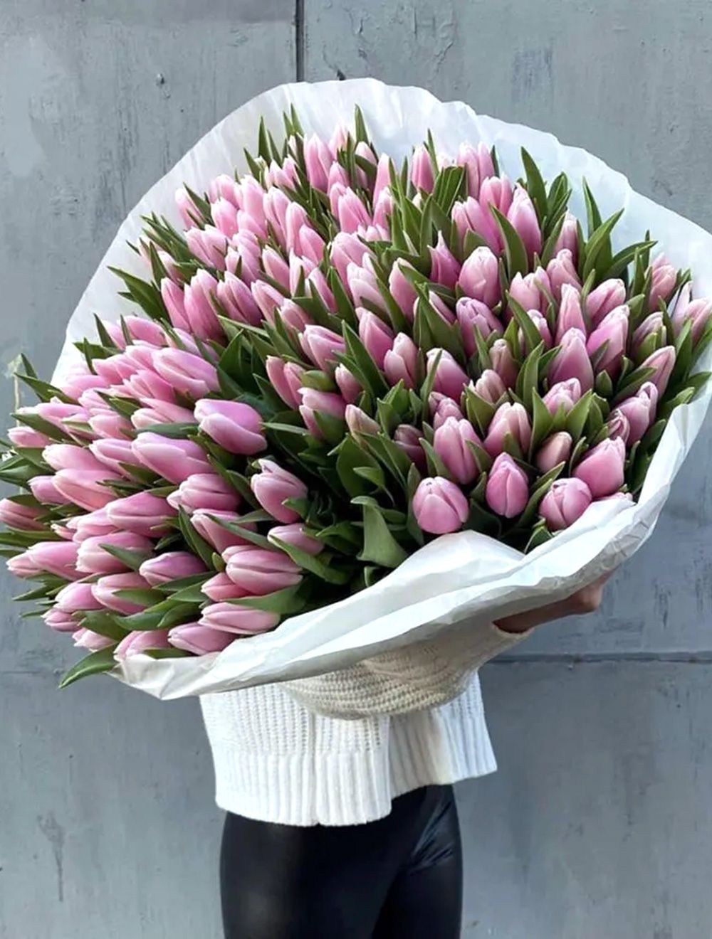 Состав: тюльпан розовый - 101 шт, упаковка, лента