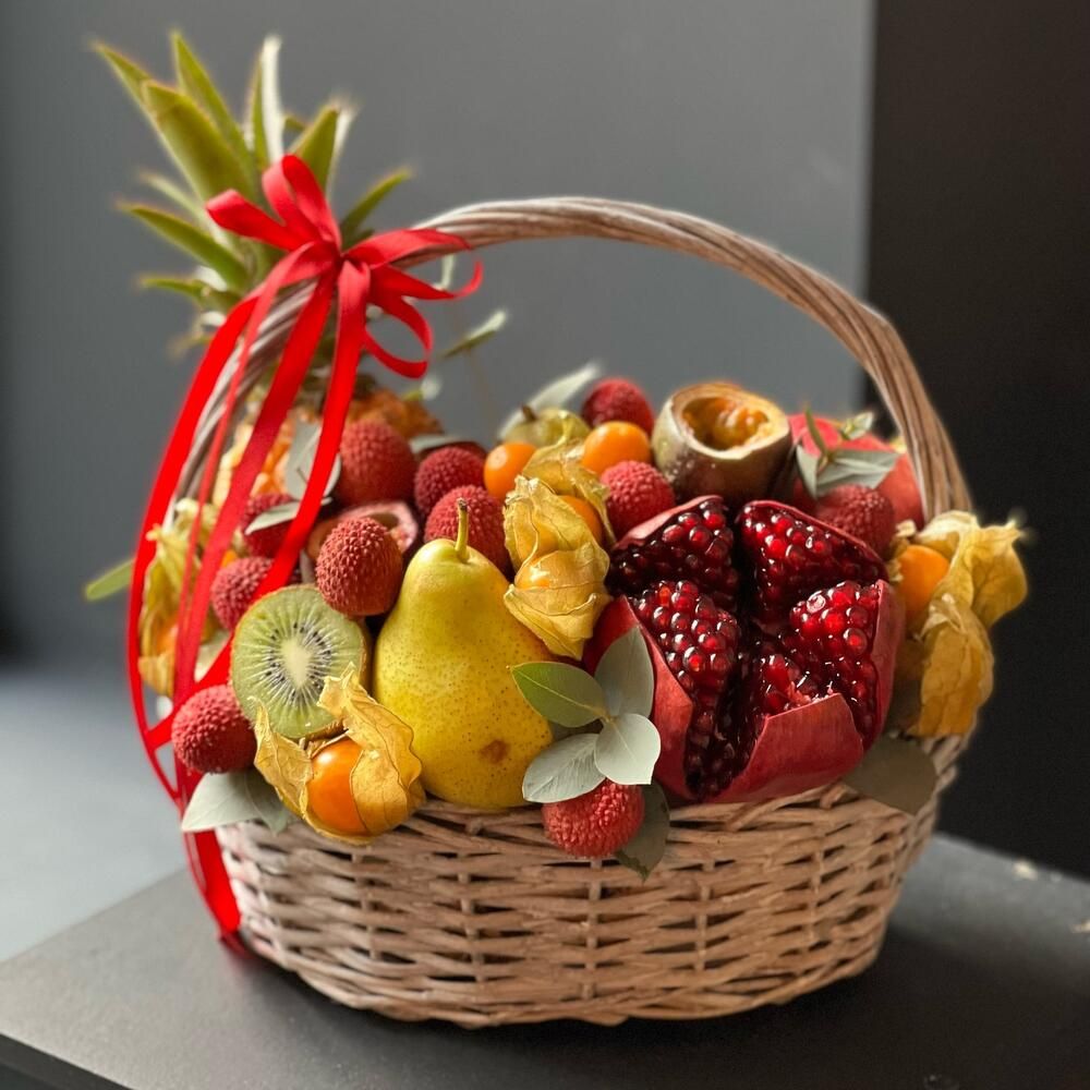 Состав: Эвкалипт - 5 шт. Лента атласная - 2 шт. Ананас - 1 шт. Киви - 2 шт. Яблоко - 2 шт. Физалис - 100 гр. Груша - 2 шт. Корзина плетеная - 1 шт. Оазис флористический - 1 шт. Личи - 150 гр. гранат красный - 1 шт.