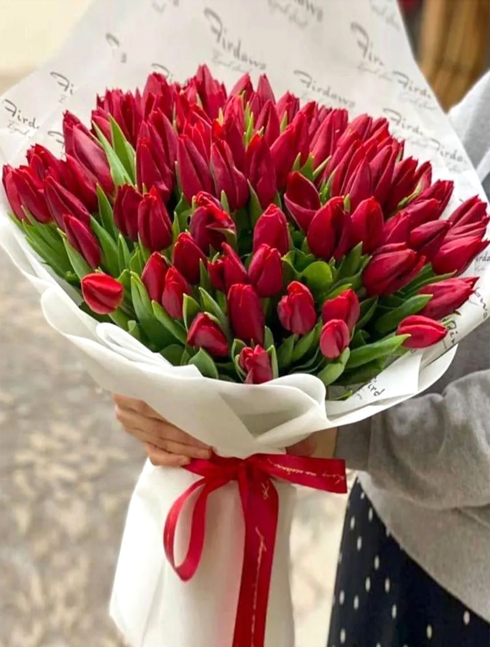 Состав: тюльпан красный - 101 шт, упаковка, лента