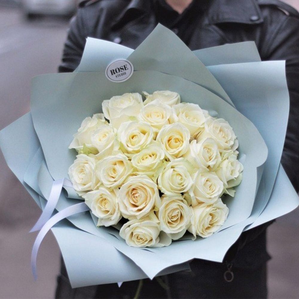 Состав: роза белая - 21 шт., упаковка -1 шт., лента - 1 шт.