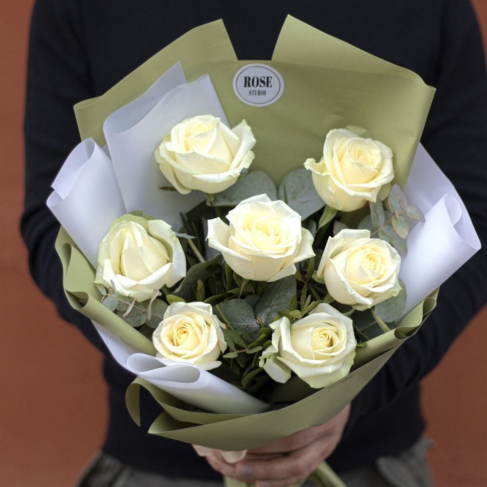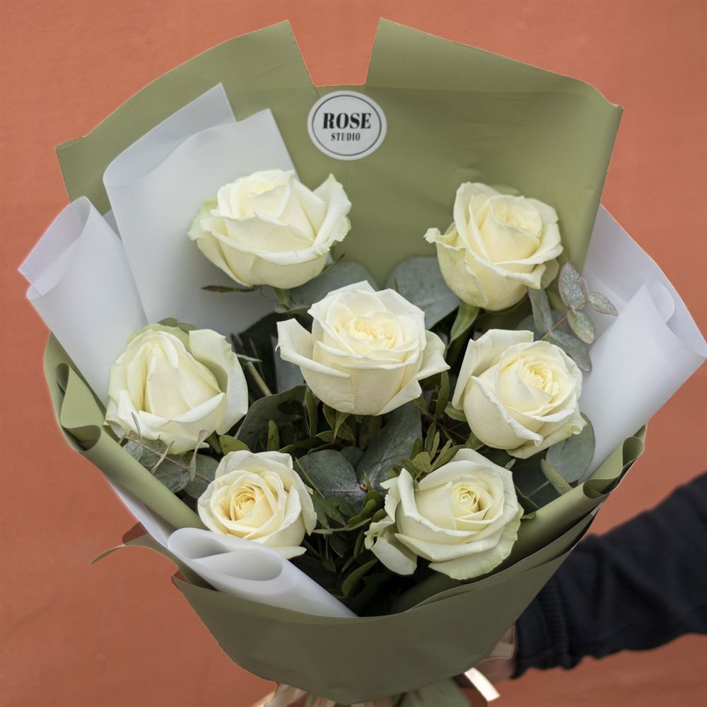 Состав: роза белая - 7 шт., эвкалипт, упаковка матовая, лента атласная