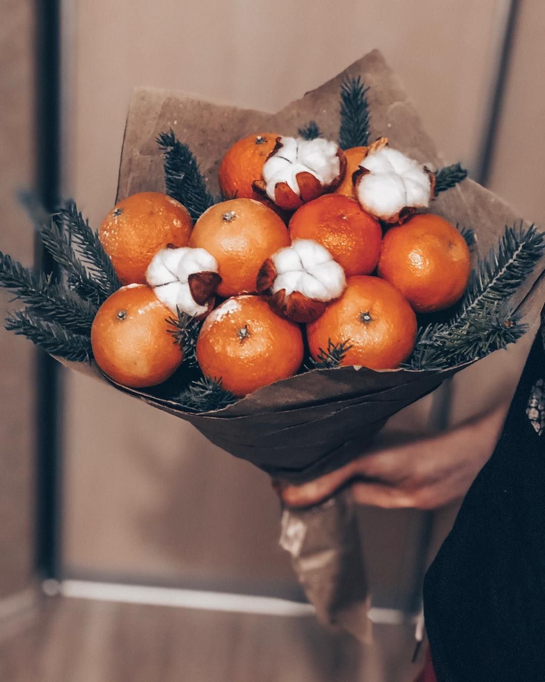 Состав букета: мандарин, хлопок, нобилис, упаковка, лента
