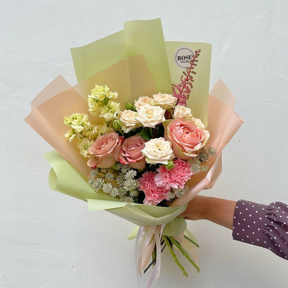 Состав: роза Капучино - 2 шт., диантус сортовой - 2 шт., астранция - 1 шт., роза пионовидная - 1 шт., роза кустовая - 1 шт., маттиола - 2 шт., астильба - 1 шт.