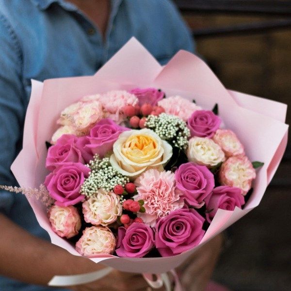 Состав: роза пионовидная — 1шт. диантус —3шт. роза кустовая —3шт. гиперикум —2шт. озотамнус —2шт. нежная розовая упаковочка —1шт. роза — 9шт.