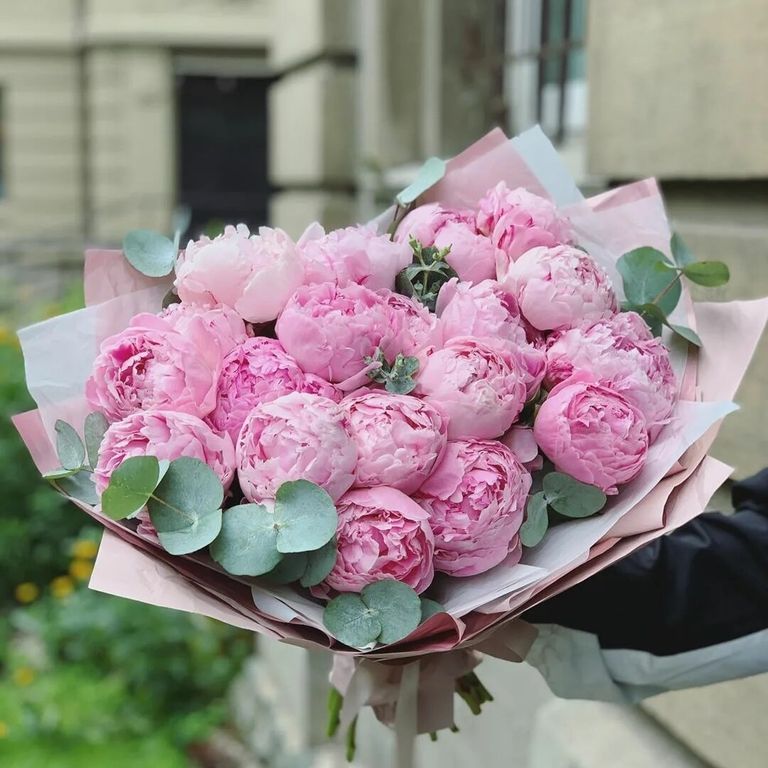 Состав: Пионы - 15 шт., Зелень, Оформление