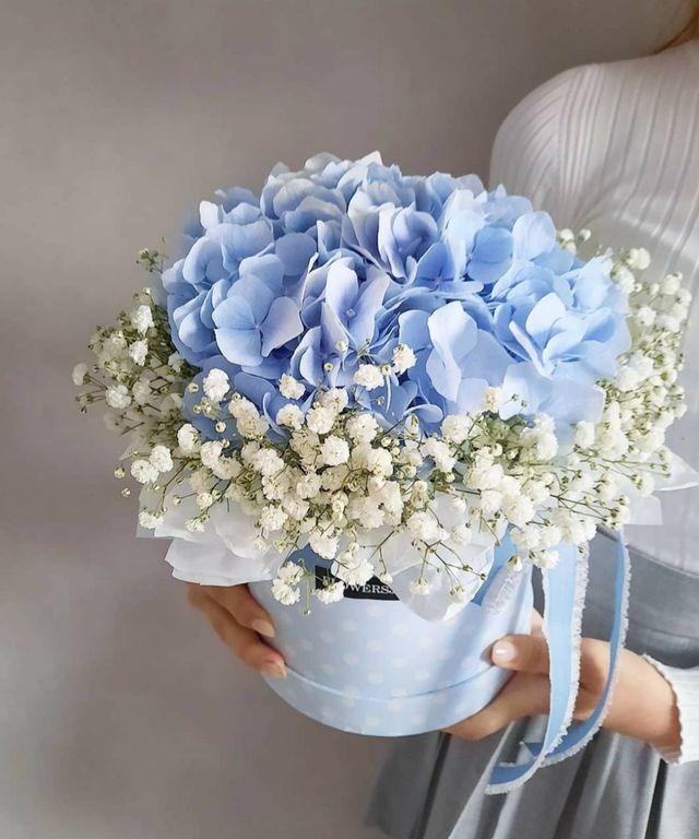 Коробка с гортензией и гипсофилой