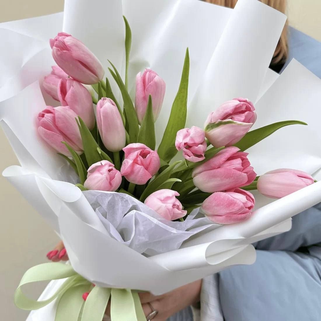 Состав: тюльпан розовый - 13 шт, упаковка, лента